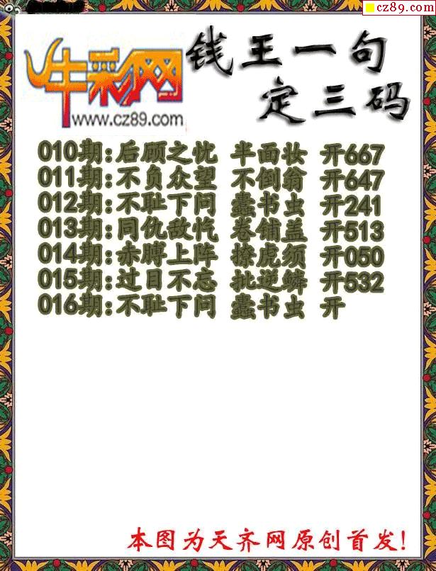 首页 > 福彩3D图谜 > 福彩3D2026016期钱王一句定三码字图谜